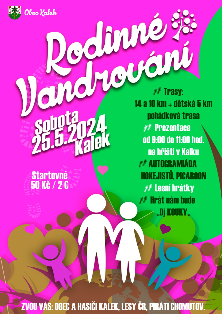 Zveme Vás v sobotu 25.5.2024 na turistickou akci RODINNÉ VANDROVÁNÍ. Sraz je u dětského hřiště v Kalku mezi 9 - 11 hod. Připravili jsme pro Vás 10, 14 km trasu a pro děti 5 km trasu pohádkovým lesem. Doprovodným programem Vás provede DJ KOUKY, čeká Vás autogramiáda hokejistů atd.