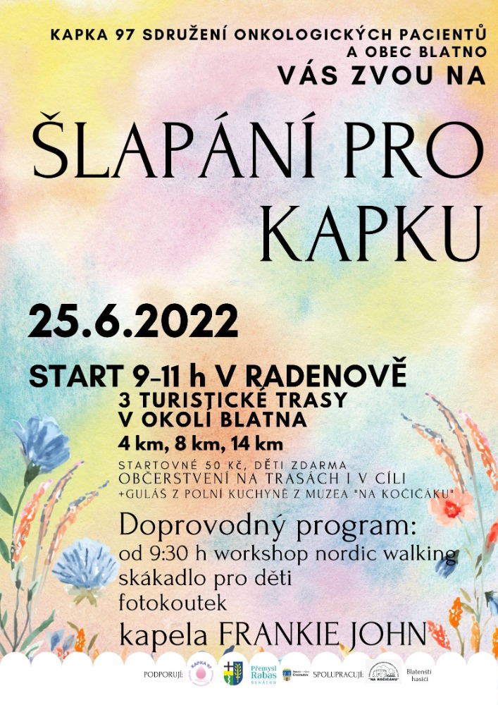Kromě příjemné procházky a zábavného programu má naše Šlapání za úkol seznámit veřejnost s problematikou a především prevencí nemoci současné doby - rakovinou a také s činností našeho sdružení, jehož hlavním cílem je pomáhat onkologickým pacientům nemoc zvládat a prožívat dál smysluplný život. Členky sdružení pro zájemce předvedou ukázku samovyšetřování prsů a k dispozici bude i velké množství informačních materiálů k uvedenému tématu.